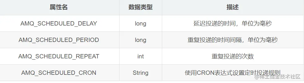 ActiveMQ还支持消息的延迟投递和定时投递,这也是针对于消息生产者的。ActiveMQ为我们提供的 ScheduledMessage 类描述了延迟投递和定时投递的四种属性: