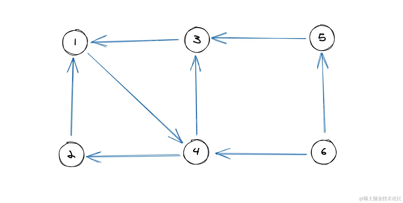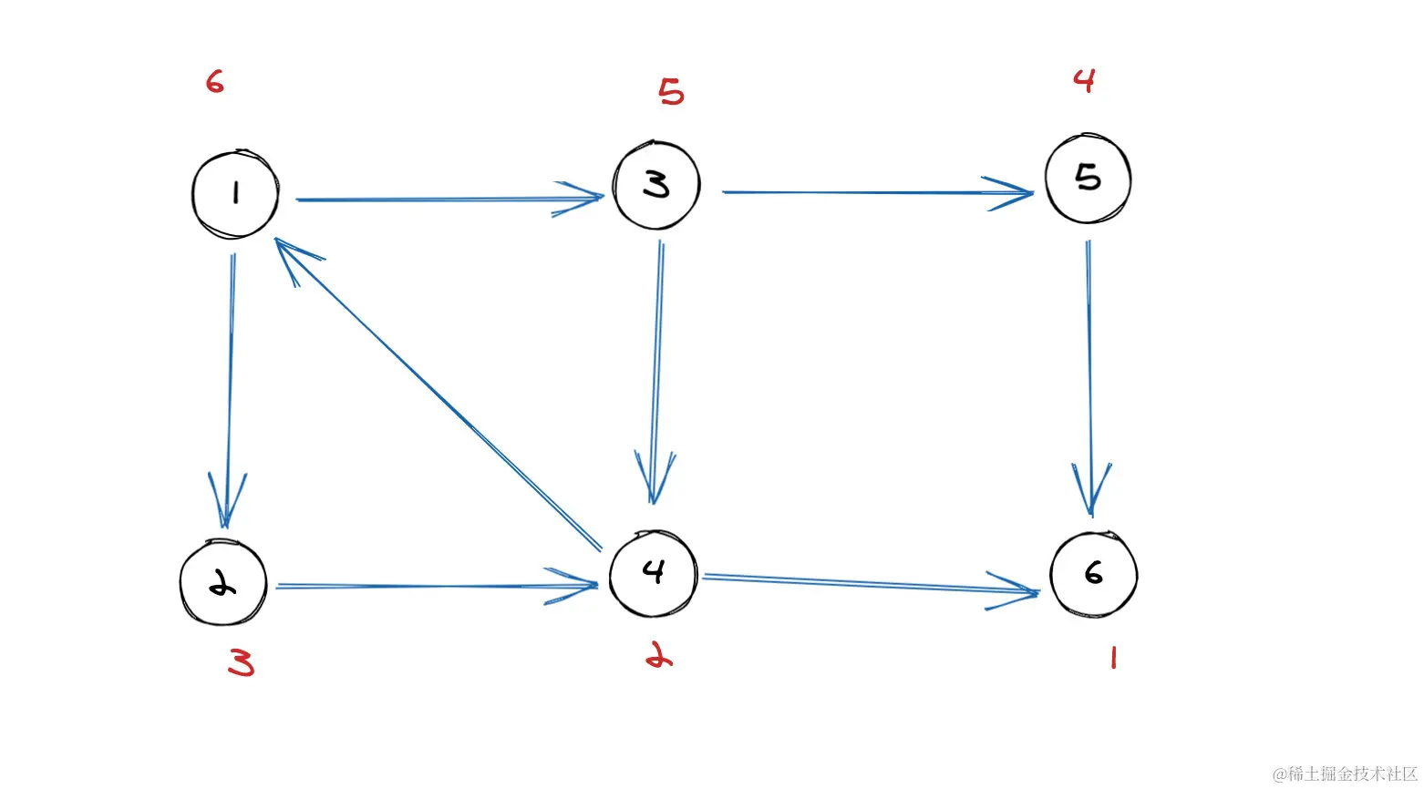 反向图也很好理解,由于我们求解的范围是有向图,如果原图当中存在一条边从u指向v,那么反向图当中就会有一条边从v指向u。也就是把所有的边都调转反向。