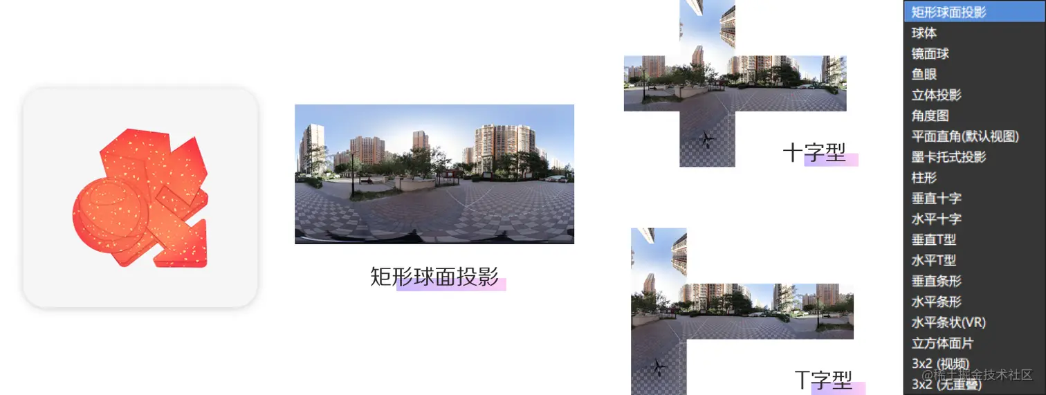 针对最基础的立方体场景,我们需要准备的贴图则分为6片,分别对应6个方位。贴图需要做到接壤位置与周围的四个贴片是图像相接的,这种类型的全景图称为「立方面片(Cube Faces)」,延伸出合成到同一张图片上的「十字型」与「T 型」。而圆柱场景对应的全景图则为「圆柱型」,球形场景对应的则为「矩形球面投影(Equirectangular)」。矩形球面投影图可以勉强用于圆柱型场景。这几种全景图可以通过算法互相转换,最简单的方法是使用 Pano2VR 软件。