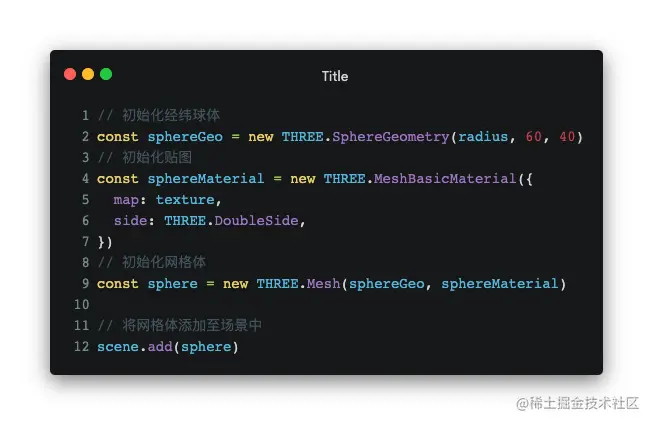 到这一步为止,整个三维场景其实已经建立好了,接下来我们往里放元素。在这个场景里我们需要的是球体元素,阿三中对应的对象为 SphereGeometry。贴图对应的是材质(Material)对象,阿三提供了若干种材质对象,我们这里仅需要用到最基础的 MeshBasicMaterial(网格基础材质)即可。将球体对象与材质对象结合到一起,就可以构成一个完整的 Mesh(网格)对象,这就是我们需要的全景球体。