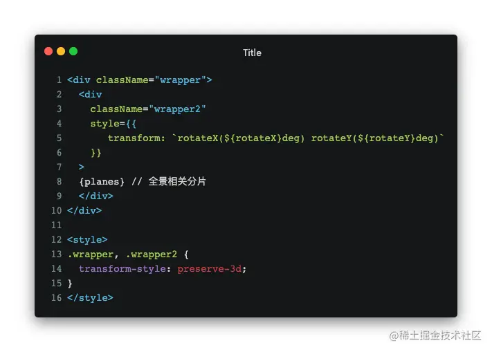 需要注意的是,这里一共需要两层 transform-style 的设置。包裹着所有切片的容器需要设置,整个场景的 3D 旋转操作就是在这个容器上。为了让这个容器的旋转也产生 3D 的效果,需要在这个容器的外层再添加一个带 transform-style 属性的容器。