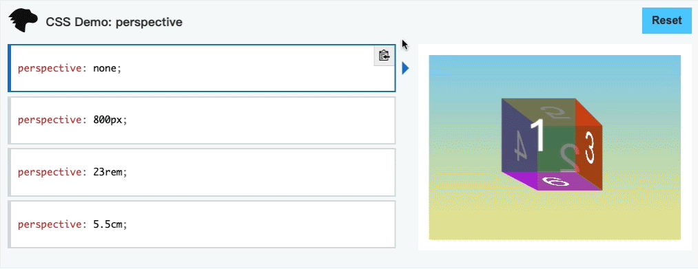 perspective 的值在三维体系中表示观察点距离 z 轴 0 坐标位置的距离,在视觉上的体现则为值越大,透视效果越弱。这么说可能很难想象,可以参考大家在坐车的时候往窗外看,近景物体与远景物体移动速度的差别,则为 perspective 值之间的差别,值越小意味着物体离你越近。默认值为 1000px,如果觉得透视效果不够明显,可以适当地减少 perspective 的值。