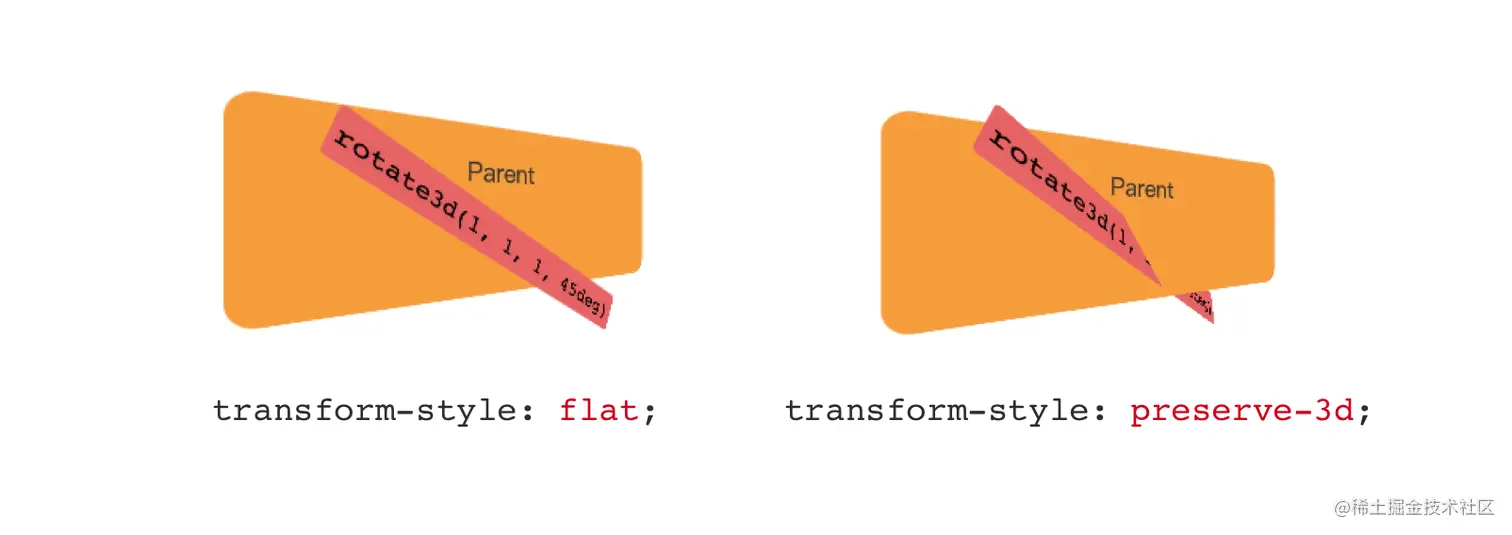 CSS 3D 建立三维场景的关键点在于三维体系的设置。涉及到三个关键属性:transform-style、perspective、transform。将 transform-style 设置为 preserve-3d,意味着浏览器以这个容器为单位建立了一个三维空间体系,这个容器下的子元素的样式属性都将按照这个三维体系下的空间关系渲染。MDN 上的这个例子可以很好地体现二维体系与三维体系中元素空间关系的区别:developer.mozilla.org/en-US/docs/…