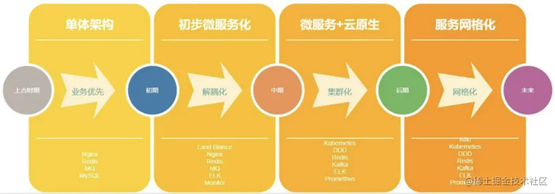 解决掉中期的麻烦后,后期则需要提高服务治理能力。之前是让一个应用起来很简单,可能一个命令就可以,当微服务扩展了很多应用,拆分的服务越来越多,每个服务的状态都要管理,这时治理会变得越来越复杂,所以这阶段会进行服务网格化。当然这个时间顺序不是绝对的,当你足够了解完全掌握了,就会明白像云原生 K8S 跟服务网格其实是可以合在一块的。
