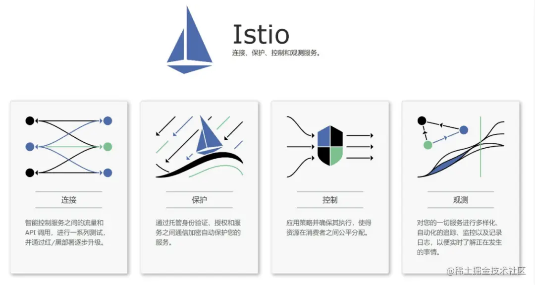 这里用了 Istio 官网上的介绍,智能控制服务之间的流量和 API 调用,通过不同 API 的流量管控可以实现红/黑部署,也称为蓝绿部署、金丝雀部署。它提供建群、流量增发,能够实现不同版本、不同服务之间流量比例的管控,可以观测,具有全链路追踪的能力。