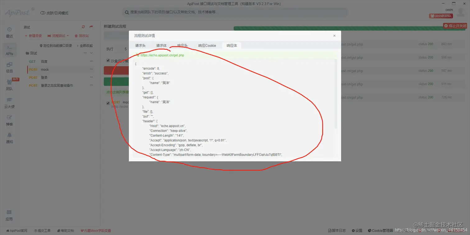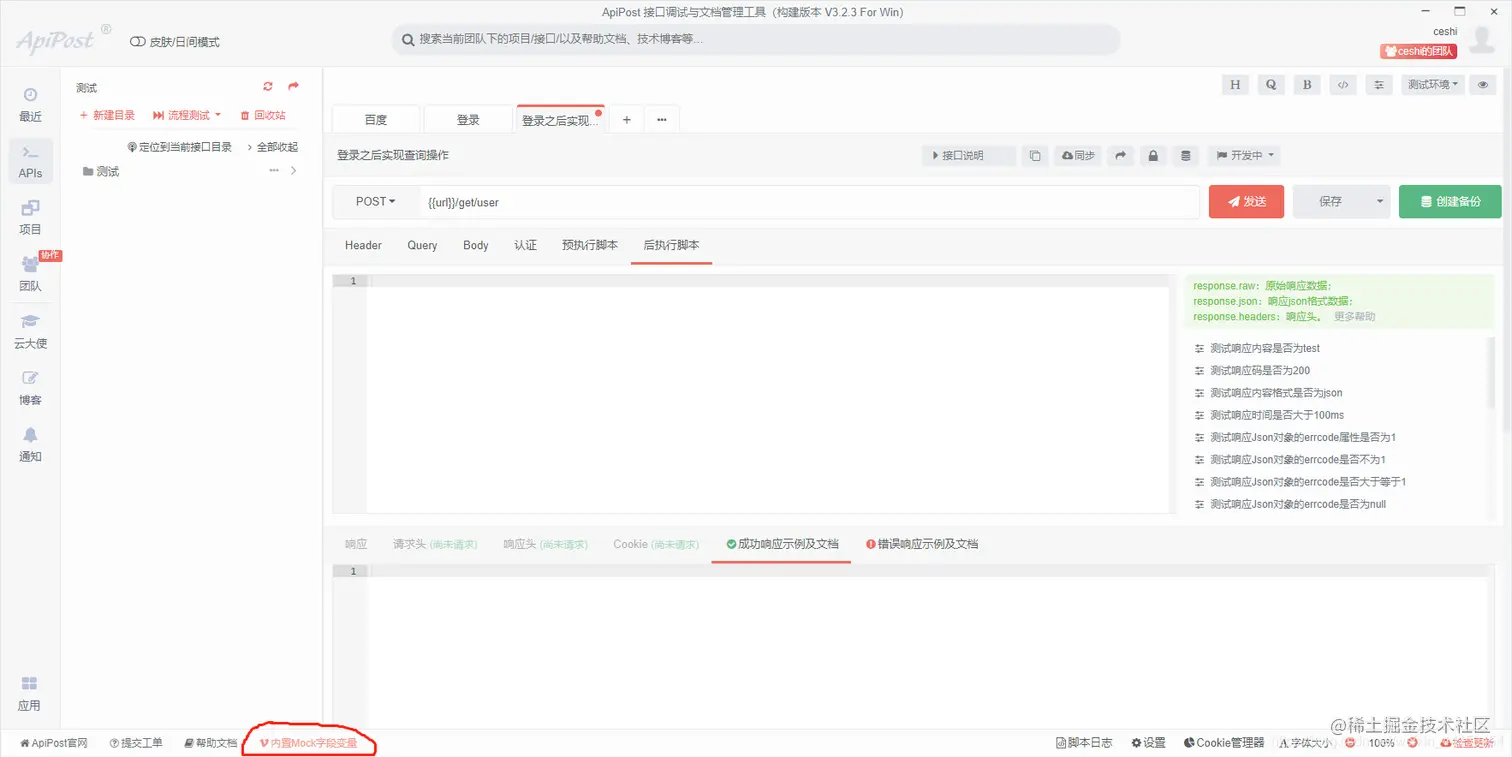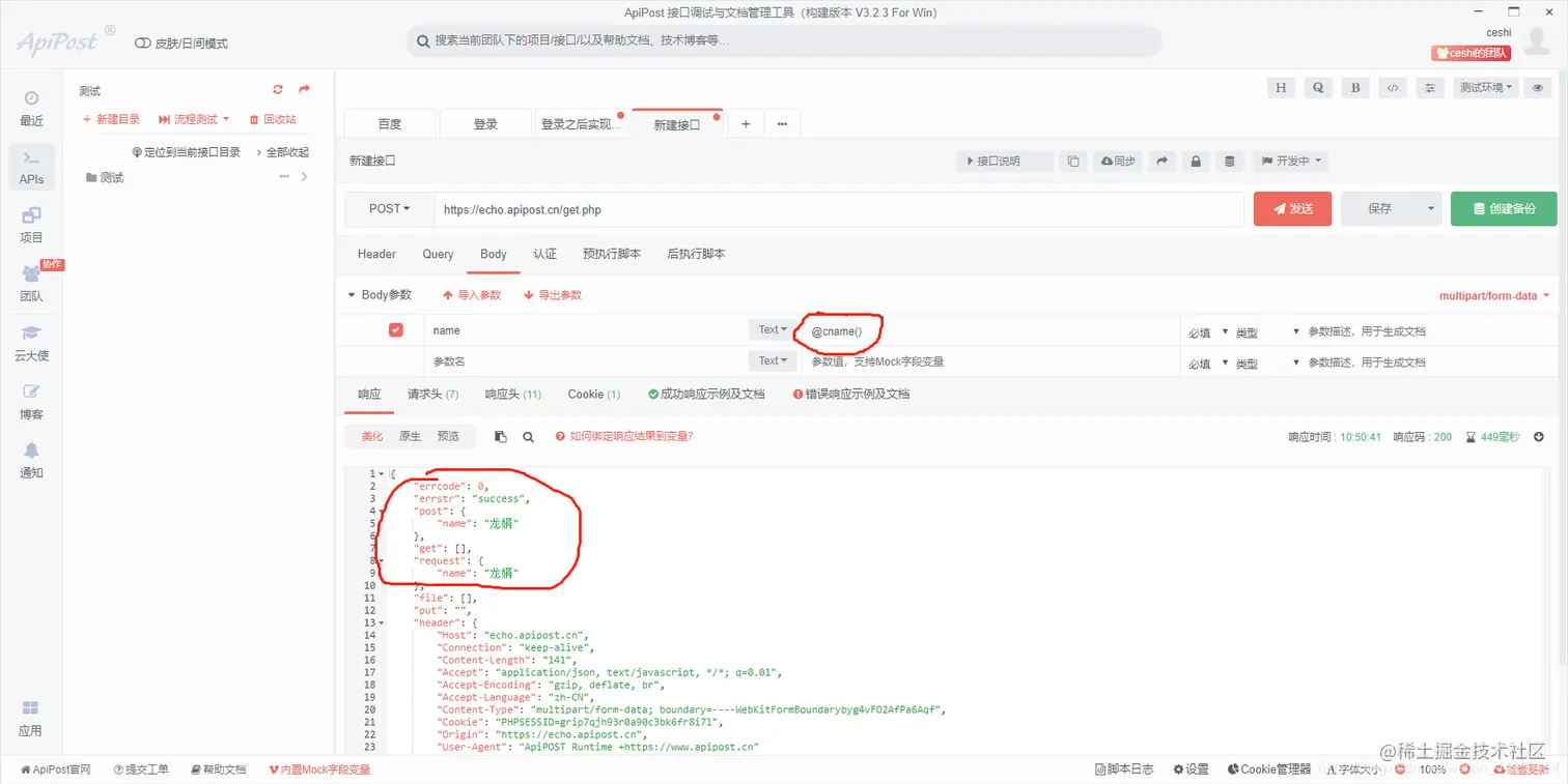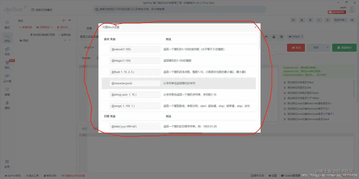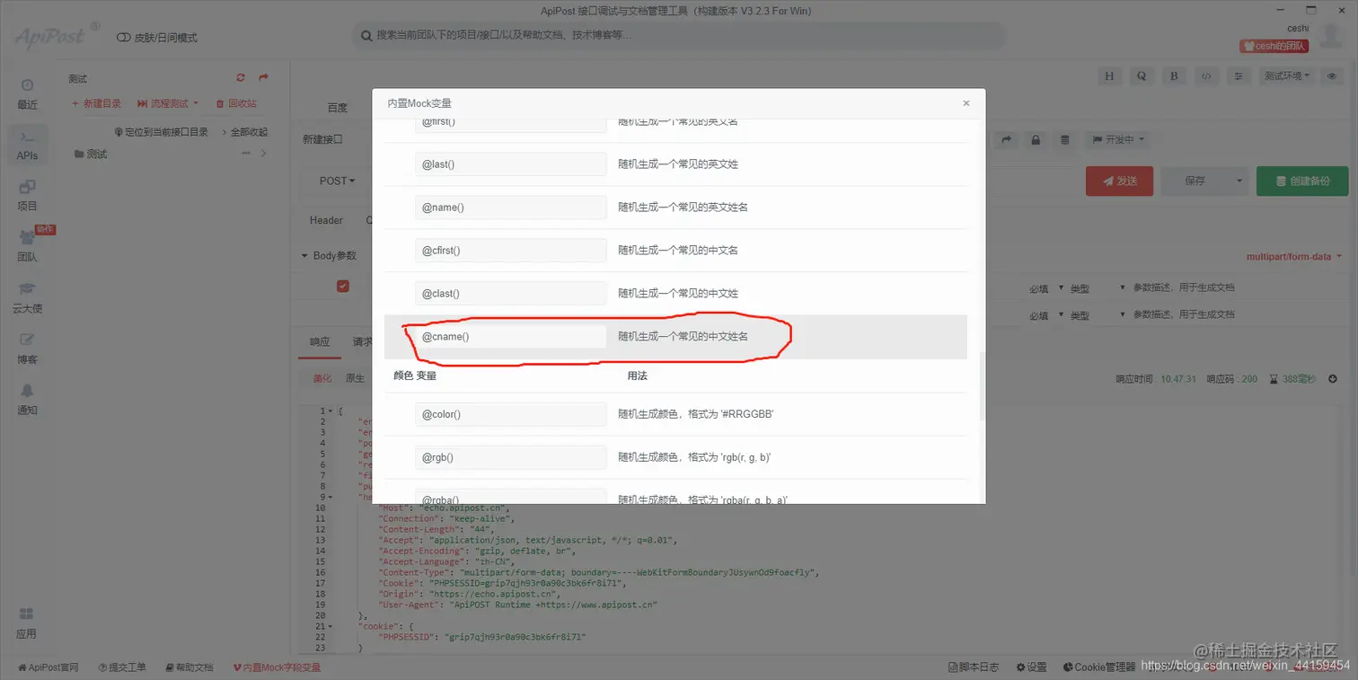 我们调用apipost里面内置的mock变量参数@cname()。因为apipost是国人自己的产品所以后面的解释也是中文的,对那些英文不好的人员就很友善。