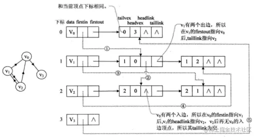 虚线箭头的含义。它其实就是此图的逆邻接表的表示。对于v0来说,它有两个顶点v1和v2的入边。因此它的firstin指向顶点v1的边表结点中headvex为0的结点,如上图圆圈1。接着由入边结点的headlink指向下一个入边顶点v2,如上图圆圈2。对于顶点v1,它有一个入边顶点v2,所以它的firstin指向顶点v2的边表结点中headvex为1的结点,如上图圆圈3。