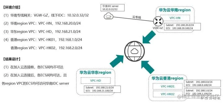 当前在华为云华南、华东、香港region均部署了业务,同时在华南region通过云专线与线下IDC打通,线下IDC有需要提供服务的IDC Server,想实现各region间正常互通以及各region与华南IDC Server数据的交互。