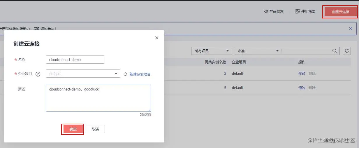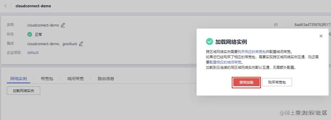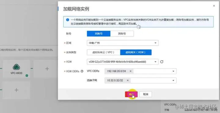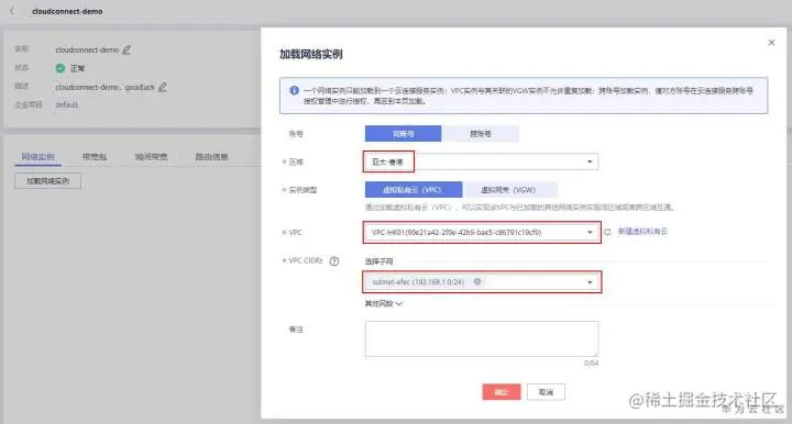 2)云连接创建好后,需要加载网络实例,将各实例打通(此处的实例指的是VPC)