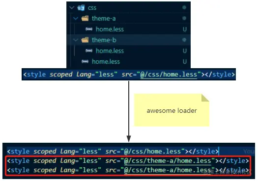 本人所在的项目中由于使用了 scoped 来避免样式冲突,使得加载不同的样式文件变得困难(vue 中 scope 的实现机制是借助 PostCSS 插件将样式文件编译成带 hash 的形式,以此来隔离不同组件的样式,具体效果如下所示)