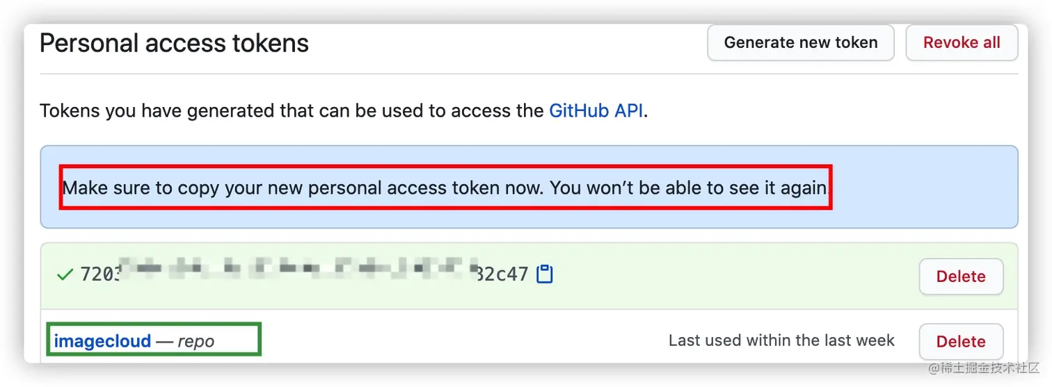 token是一串字符。注意看红框的提示,这个token只显示这一次。下次在看到它时,它就只显示你填写的note了,就像下面绿框所示的一样。