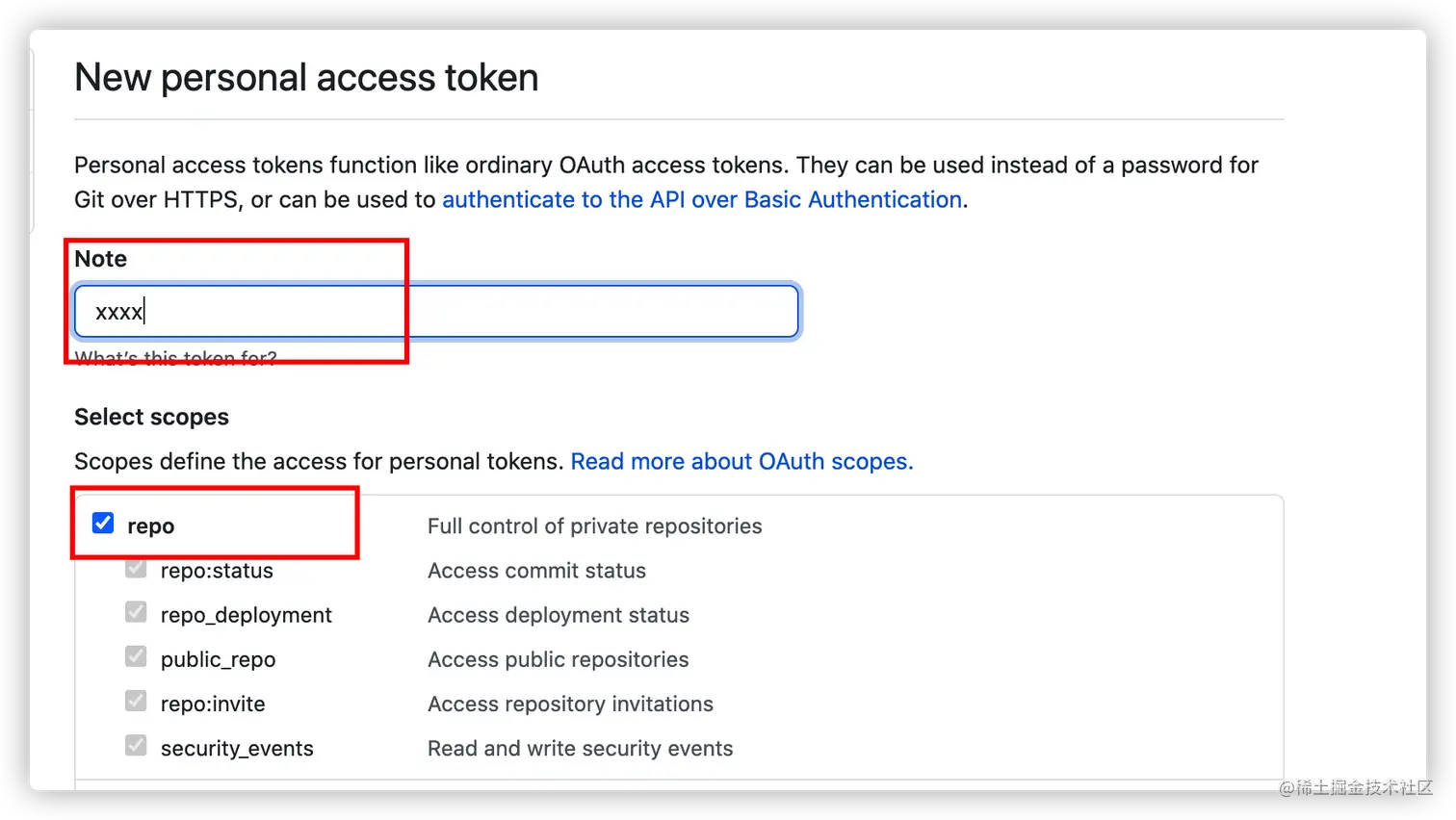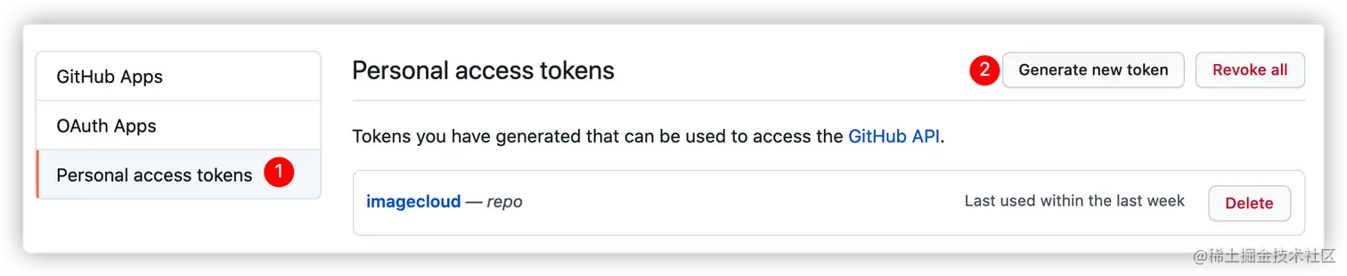 Personal access tokens, 然后点击generate new token。这一步会提示输入账户密码,验证完密码后会继续后面的操作