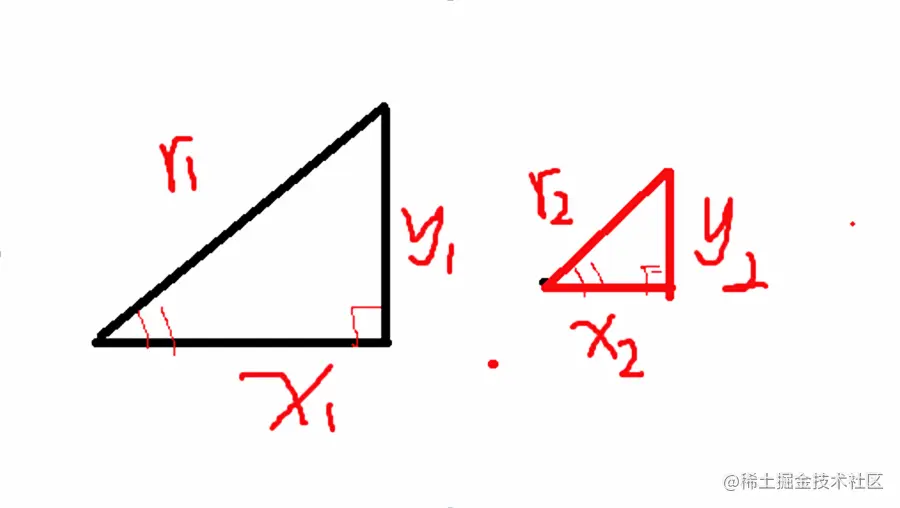 根据三角形相似,可以得到 x1/r1 = x2/r2, y1/r1 = y2/r2,x1/x2 = y1/y2,这些比例等式,以及他的变化如:
