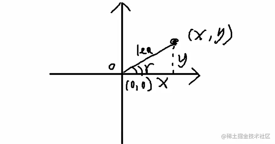 先看一个坐标系,已知一个点的坐标为(x, y), 已知原点为(0, 0), 坐标距离原点的距离为len