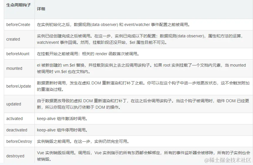 - 会触发 下面这几个beforeCreate, created, beforeMount, mounted 。