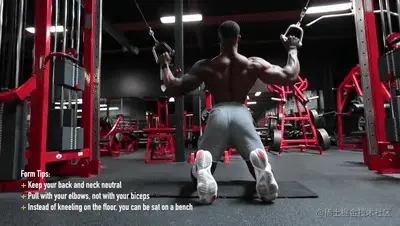 背部和脖子保持直立,下拉时注意力放在背阔肌上,而不是肱二头肌;可以跪在地板上,也可以坐在长凳上练习。 图片是使用龙门架锻炼,在健身房中也有类似的专门器械来做相同的动作。新手可以先坐着锻炼,锻炼的时候头部向前上方看发力感会好一些,牛逼的大佬可以跪着(牛逼了你跪着也没人敢占你便宜)