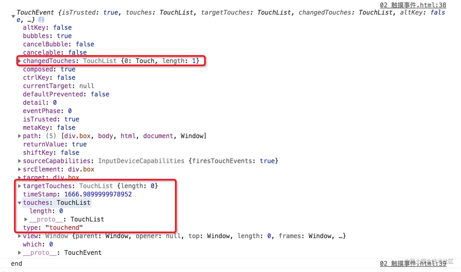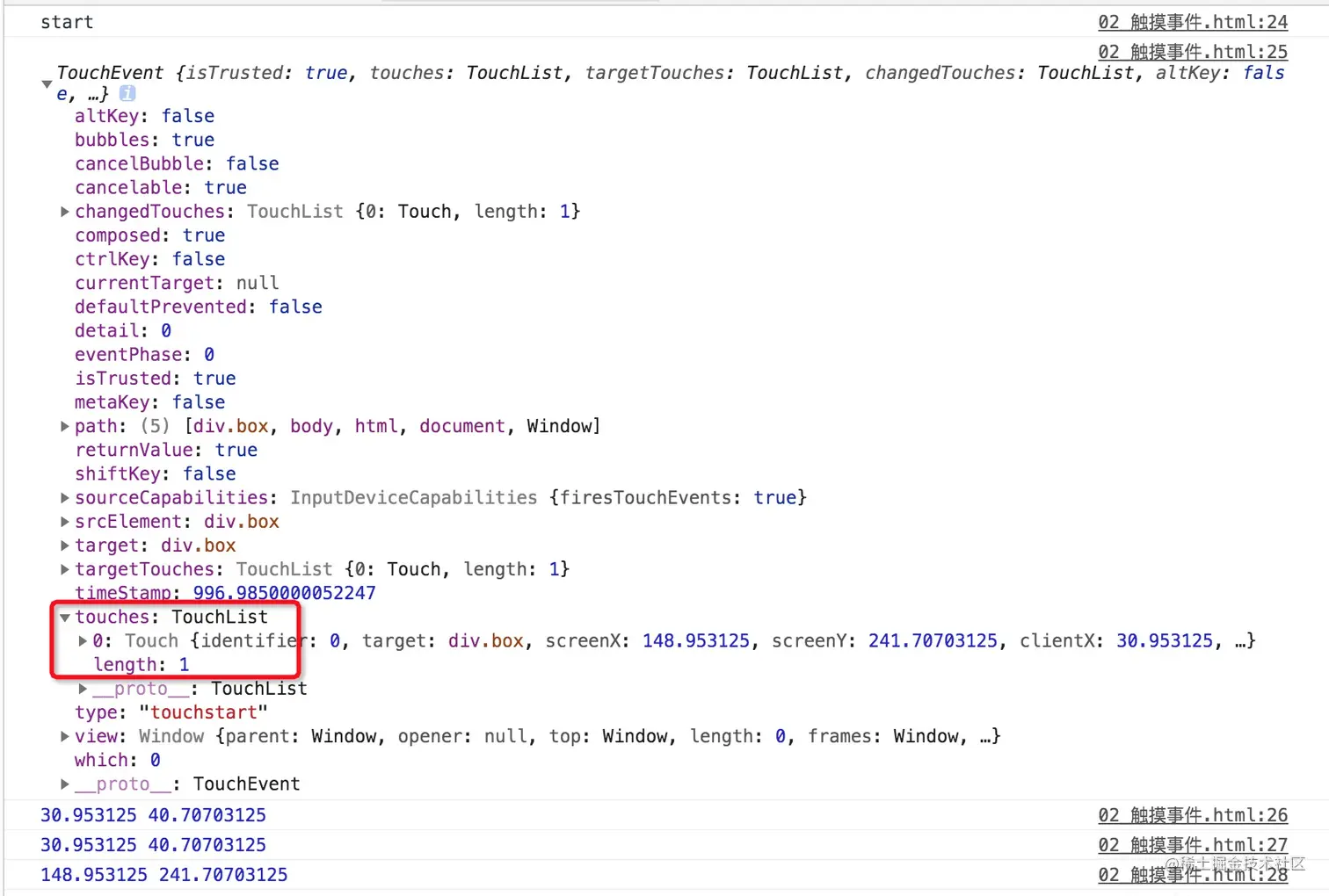 通过上面的打印可以看到 changedTouches 每个事件都会记录, targetTouches、touches 在离开屏幕touchend的时候无法记录触摸点