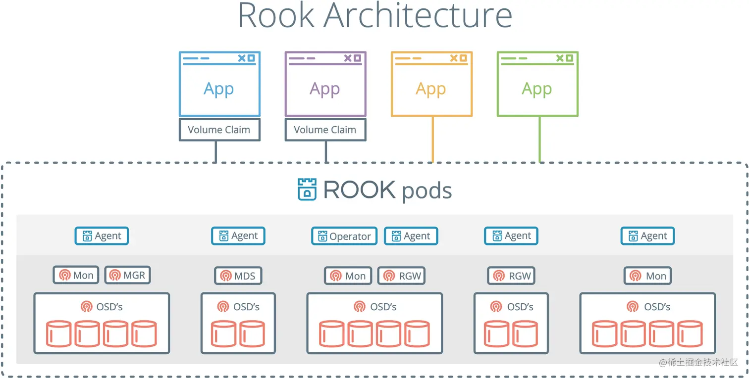 Rook 用 Kubernetes Pod 的形式,部署 Ceph的MON、OSD 以及 MGR守护进程。