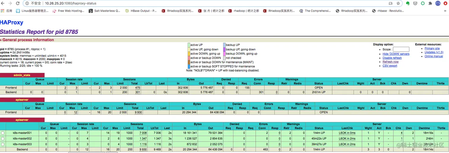 以上,kubernetes的master高科用就部署完毕了。 现在你可以通过haproxy的web管理界面,可以看到三个master已经可用了。