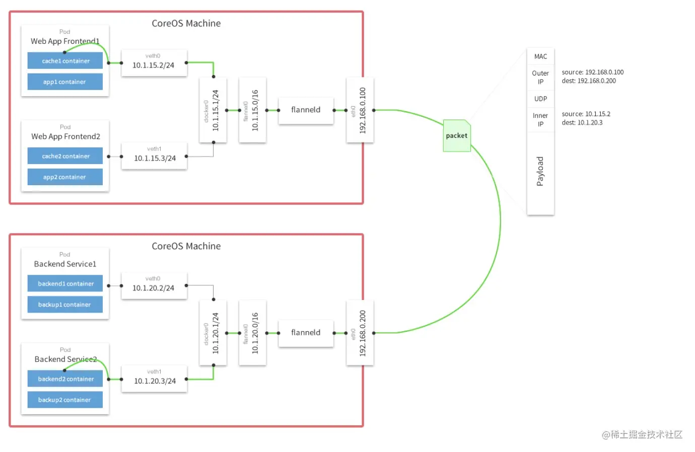 ###Flannel介绍 Flannel: CoreOS 开源的网络方案,为 kubernetes 设计,功能是让集群中的不同节点主机创建的Docker容器都具有全集群唯一的虚拟IP地址。Flannel的底层通信协议的可选余地有很多,比如UDP、VXlan、AWS VPC等等,不同协议实现下的网络通信效率相差较多,默认为使用UDP协议,部署和管理简单。 Flannel的后台数据也存储于ETCD中。