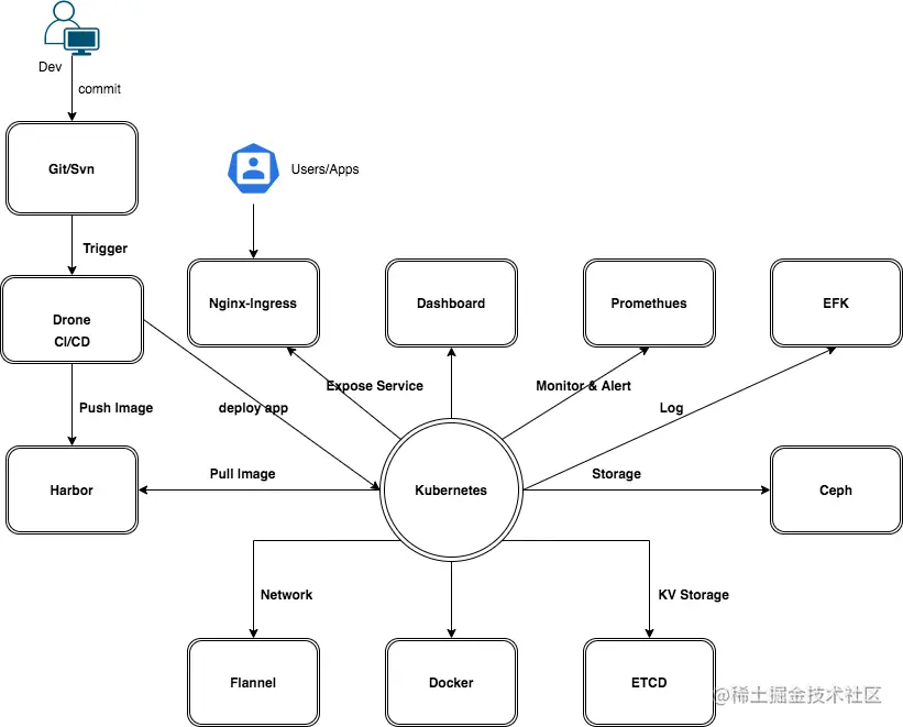 最近整理笔记,不知不觉发现关于kubernetes相关的笔记已经达99篇了,索性一起总结了。算是对这两年做容器云平台的一个总结,本文是开篇,先介绍下所有用到的组件。首先来看下架构图(实在画的太丑,求推荐工具)