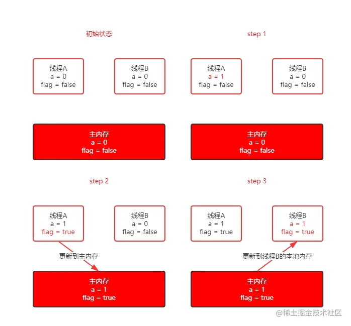 - 线程A修改普通变量,step 1,设置 a = 1;