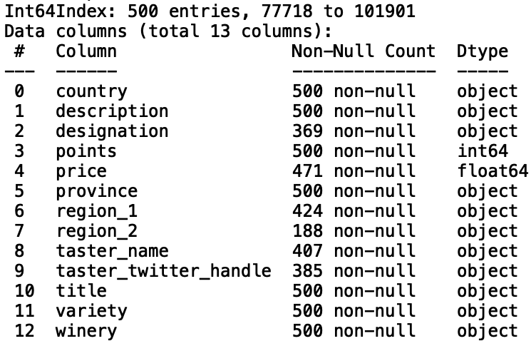 df = pd.read_csv("winemag-data-130k-v2.csv").sample(n=500, random_state = 42)