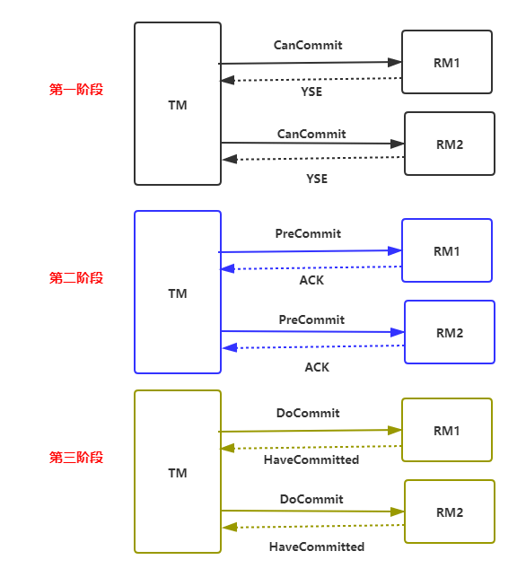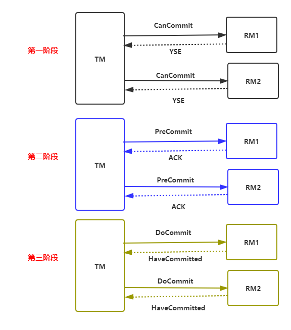 canCommit阶段(第一阶段) :事务管理器TM向所有的资源管理器RM 发送CanCommit请求, 询问是否可以执行事务提交操作。然后开始等待参与者的响应。各参与者向协调者反馈事务询问的响应,如果参与者认为自己可以顺利执行事务,就返回 Yes,否则反馈 No 响应。
