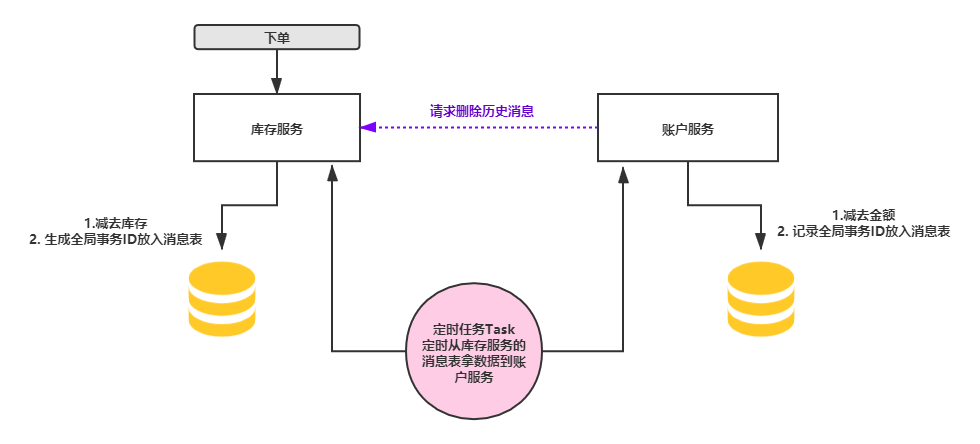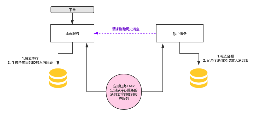1). 用户购买一件商品,库存服务把减少库存操作和插入本地消息表的操作作为一个事物执行,保证同时失败和成功。2). 假如步骤1成功,这个时候库存服务的消息表多了一条需要账户服务执行账户操作的记录数据。3). 账户服务会定时去库存服务拿库存服务的消息表数据,如果发现有需要自己执行的任务,则会执行扣除金额操作,但是并不是单纯的减去金额,是把减去账户金额和把从库存服务中拿到的全局事务ID等信息作为一个完成的本地事务写入到自己的消息表中记录,然后请求库存服务删除库存服务的消息表中对应的记录。