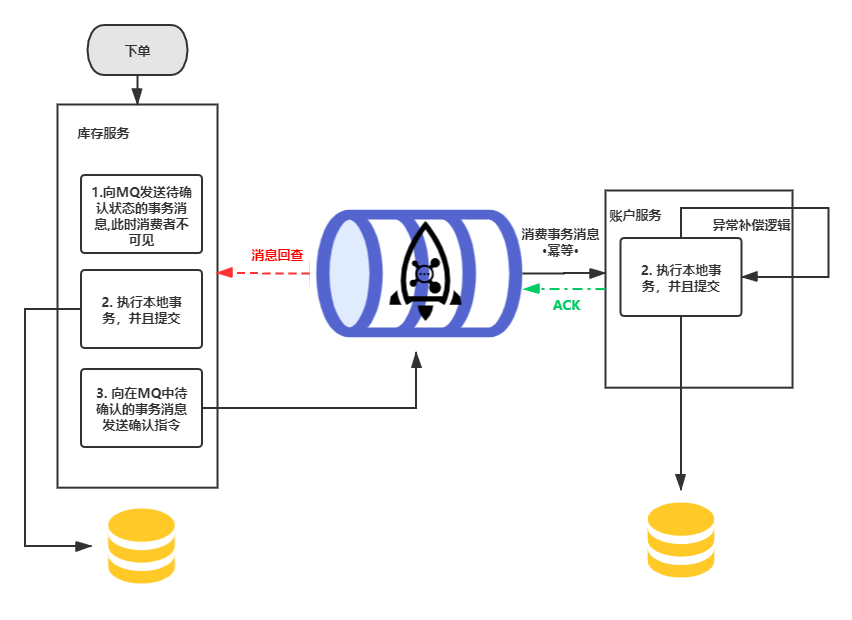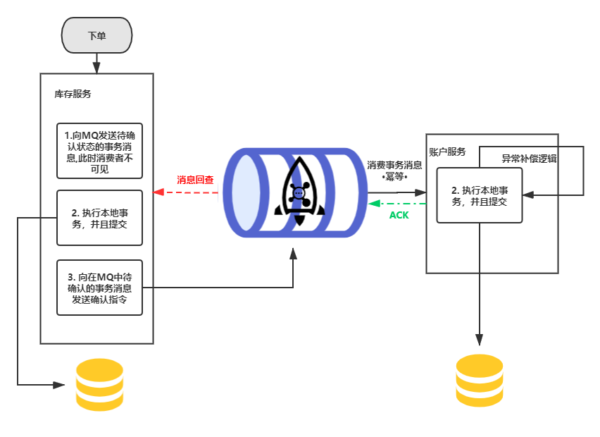 1). 用户下单,库存服务首先向MQ发送一个事务消息,状态是待确认,这个时候账户服务是不可见的。2). 步骤1成功后,库存服务执行减库存的本地事务。3). 步骤2成功后,向MQ中待确认的事务消息发送确认指令。4). 账户服务拿到该事务消息,执行减去金额的操作事务。