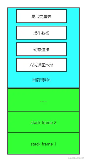 其中位于栈顶的栈帧是当前栈帧,所对应的方法是当前方法,java的执行引擎所执行的字节码指令值只针对当前栈帧操作。其实这也很好理解,我们通常都是在一个方法内又调用另一个方法,形成一个调用链,这样位于最底层的栈帧就是这个调用链的源头。