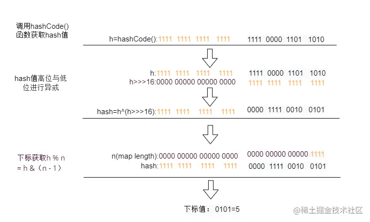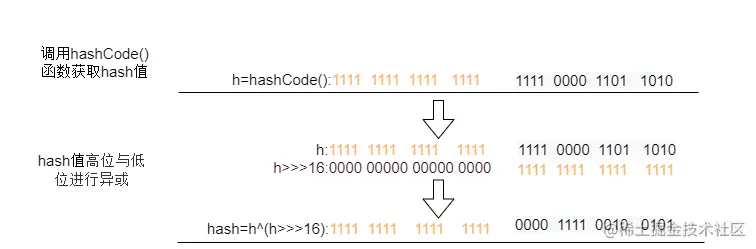 - 然后将hashcode左移16位的值进行与或,即将高位与低位进行异或运算,减少碰撞机率。