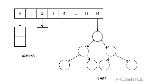 JDK1.7使用的是数组+ 单链表的数据结构。JDK1.8之后,使用的是数组+链表+红黑树的数据结构