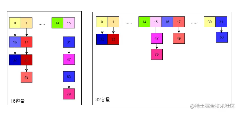 原索引+oldCap”,可以看看下图为16扩充为32的resize示意图: