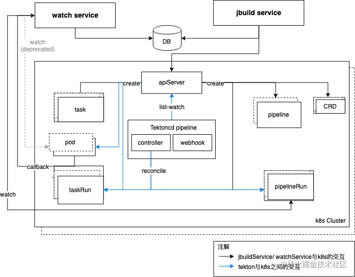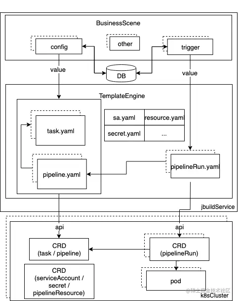 此服务对上述的三个阶段复杂的逻辑进行屏蔽, 向外透出简单的接口, 用户无需关心 task/pipeline/pipelineRun 之间参数传递,无需关心 pipeline 如何对 task 如何进行编排。