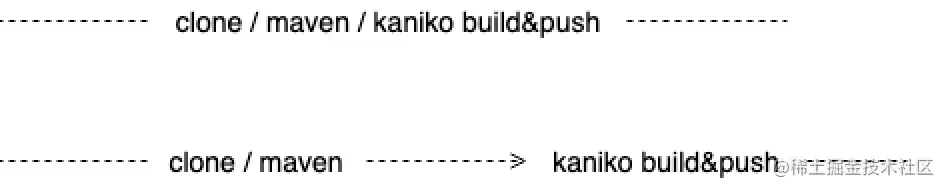 示例1:Java 应用构建完成后使用 kaniko 产生镜像并推送到镜像仓库, 这个实例相对简单,因此直接串行之行各个步骤即可, 展示了两种可行方案。