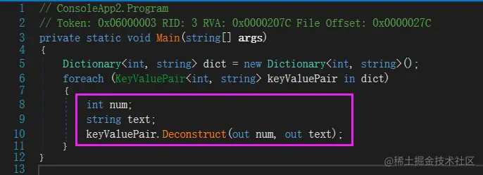 我去,这回就清晰了,从图中可以看出,我写的 (x,y) 压根就没有 ValueTuple 的影子,说明在这个场景下两者并没有任何关系,也就是说同样是 (x,y) ,放在不同位置具有不同的表现形式,这就很让人琢磨不透了, 可能有些朋友不死心,想看一下 Deconstruct 到底干了什么,知道的朋友应该明白这个新玩法叫做解构方法,继续看代码: