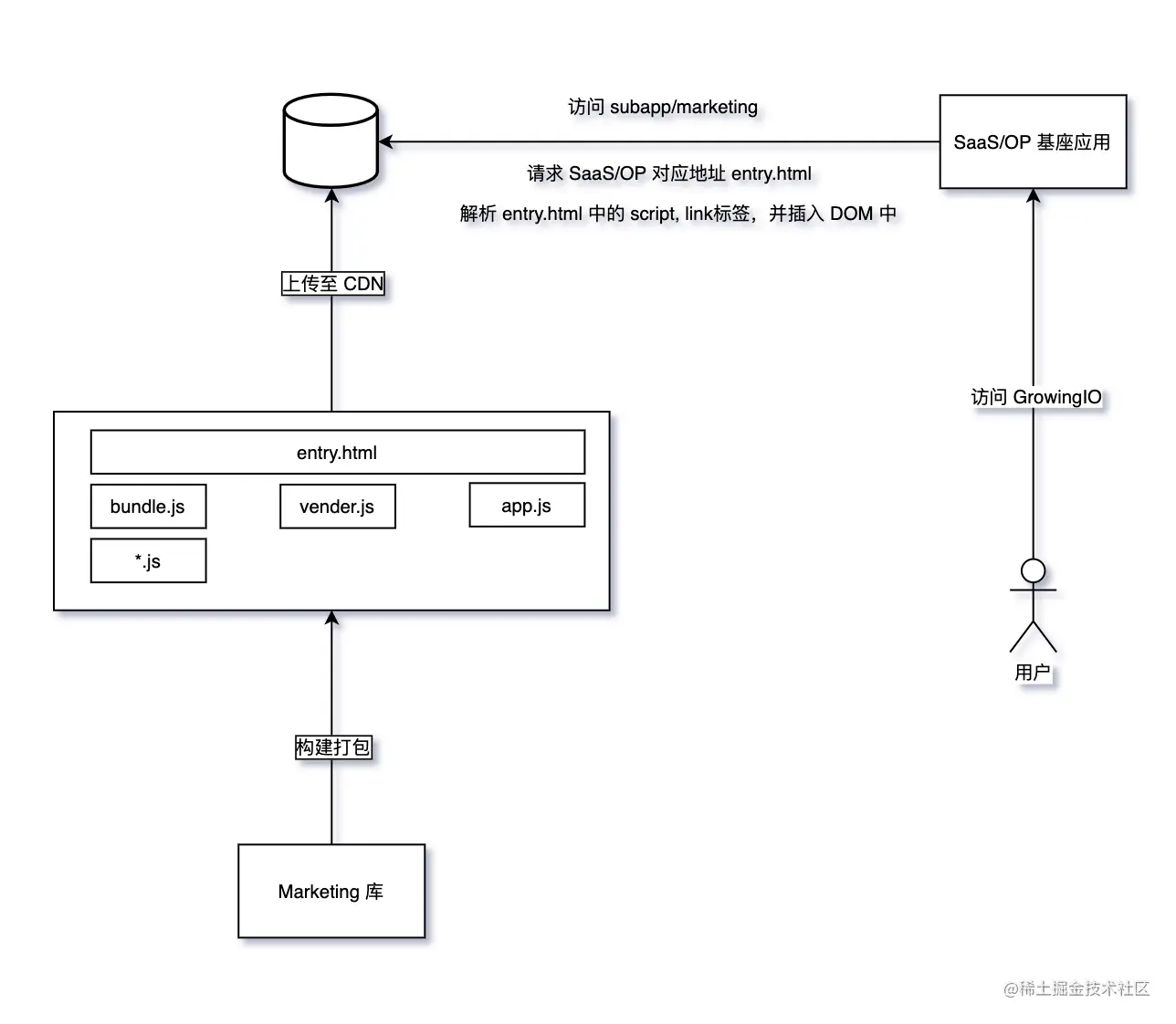 对应的 GrowingIO 实际情况是,Marketing 作为一个独立的子应用,需要嵌入 SaaS 和 OP 当中: