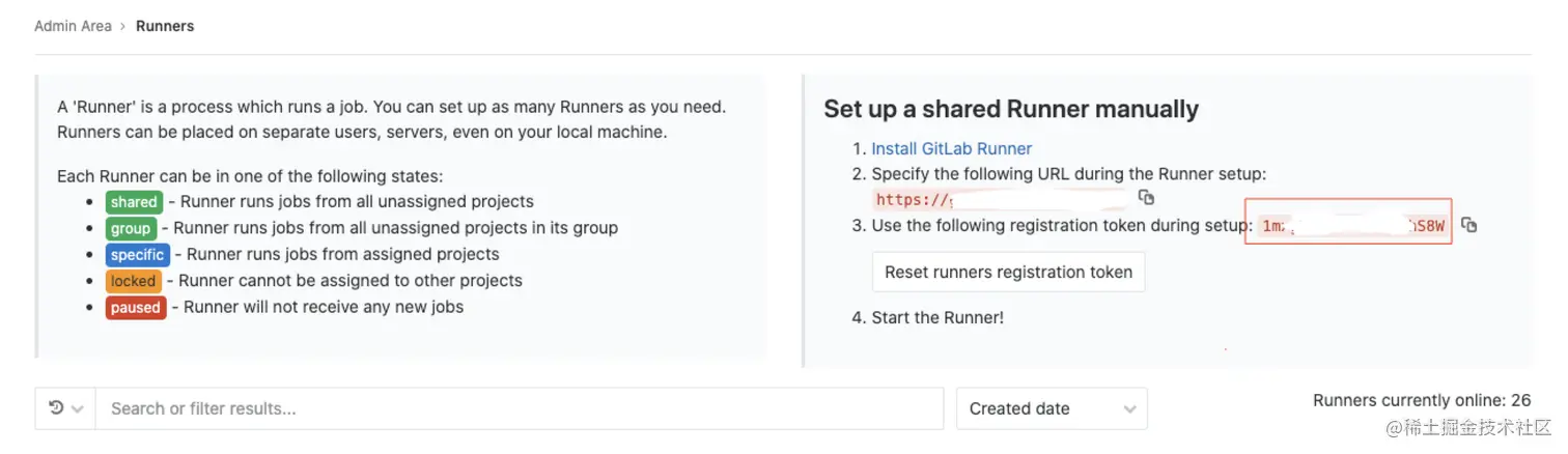 完成之后,到 https://your-gitlab-domain/admin/runners 就能看到你刚刚注册的runner了,以及这个runner的token(下面会用到)