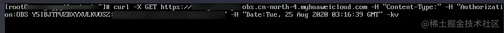 curl -X GET bucketname.obs.cn-north-4.myhuaweicloud.com -H "Content-Type:" -H "Authorization:OBS Y5IBJTPVZBXYXVLKVOSZ:*****" -H "Date:Tue, 25 Aug 2020 03:16:39 GMT" –kv