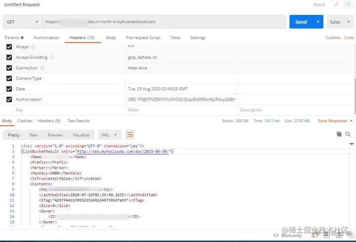 将其进行加密并进行编码后,获得Authorization头域为:OBS Y5IBJTPVZBXYXVLKVOSZ:L0h7P/XDJltLkT/arekZy3Ysh68=
