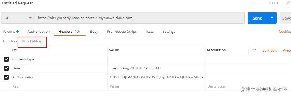 当在请求中不手动指定“Content-Type”等头域时,Postman会自动生成头域,可能会导致签名不匹配的情况,可通过点击红框中的按钮将隐藏头域显示以便定位此类问题;