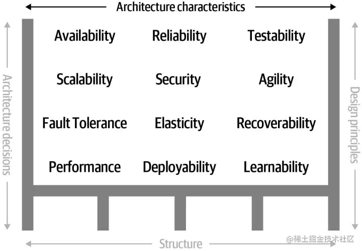 Mark Richards和Neal Ford在书中,从四个维度上对软件架构进行了描述,分别是Structure、Architecture characteristics、Architecture decisions和Design principles。