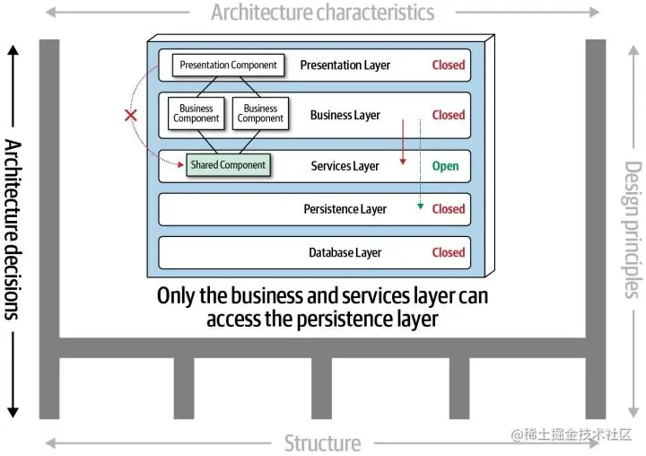Architecture decisions描述了开发软件系统时所必须遵循的规则,比如图中例子,对于一个分层架构风格的系统而言,开发工程师需要遵循以下规则:只有业务层才能直接访问服务层,表现层不能直接访问服务层。Architecture decisions更多的只是一种约束,违反了这种约束可能并不会对系统的功能造成影响,但是却是系统架构腐化的源头。