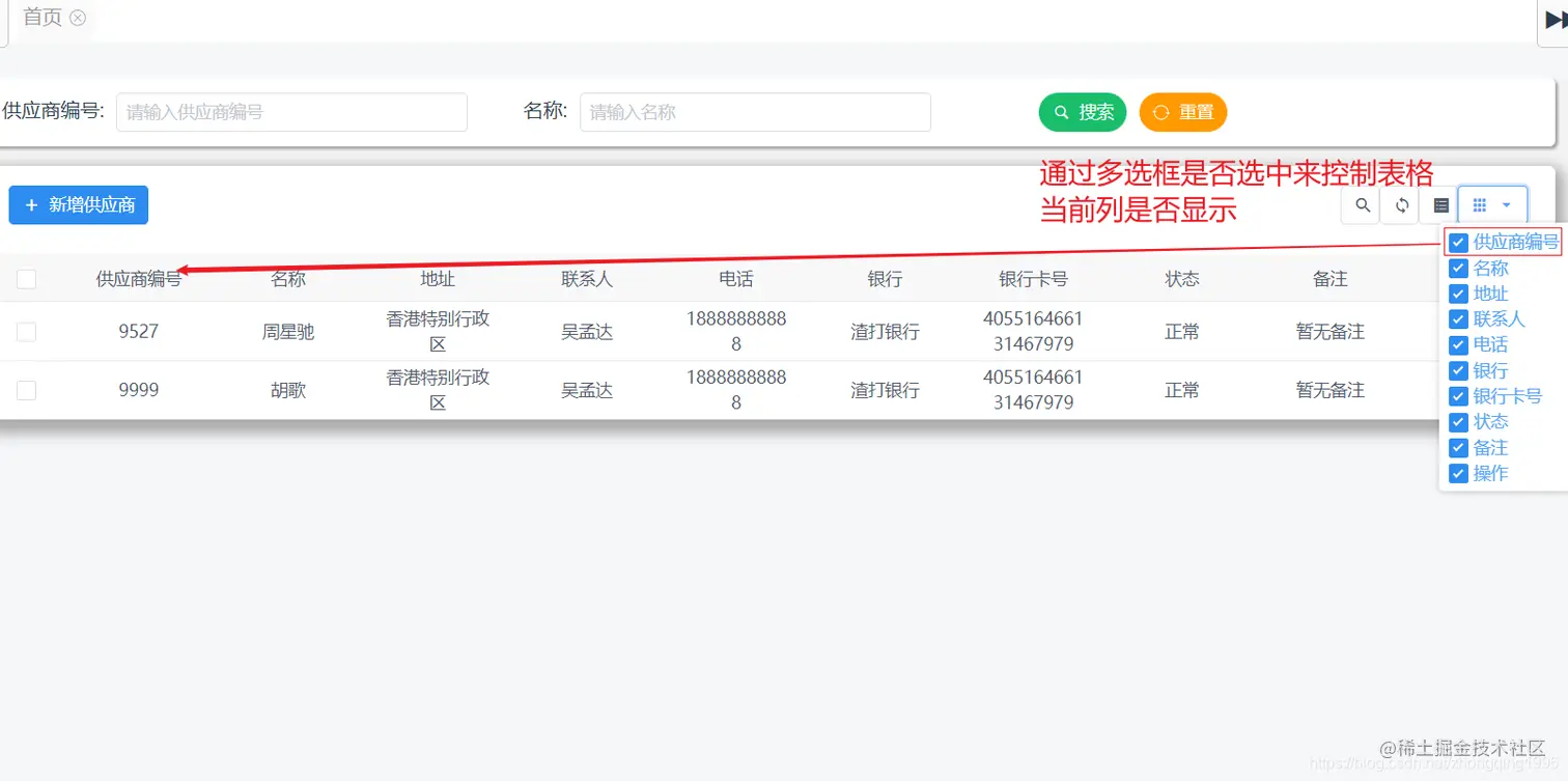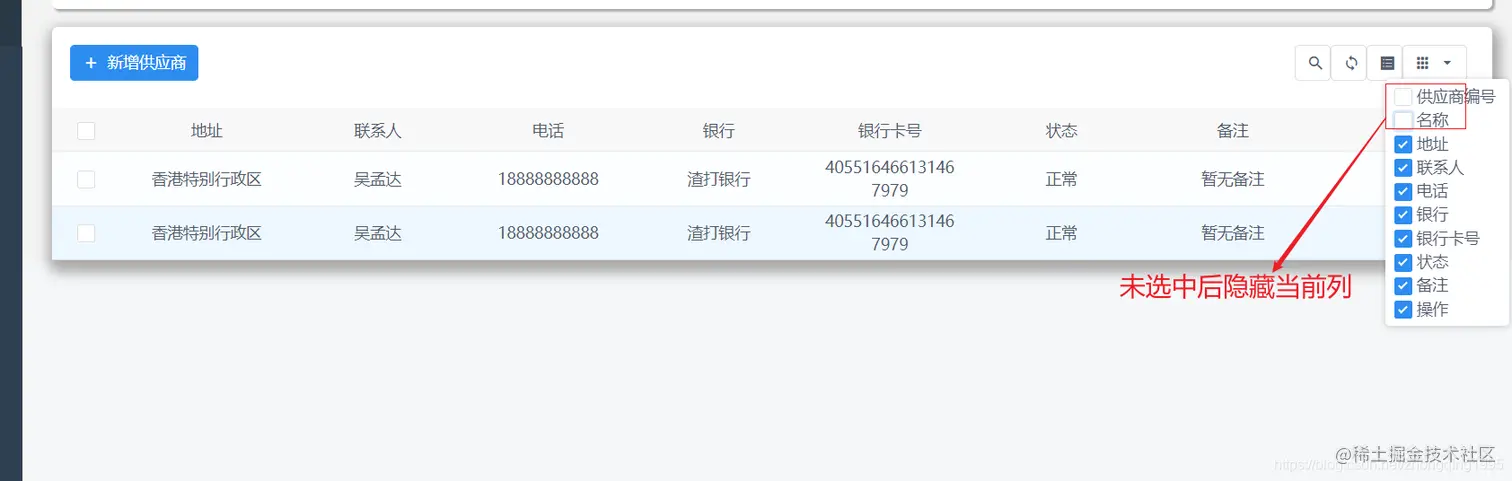 1.通过多选框是否选中来控制表格对应的列是否显示,