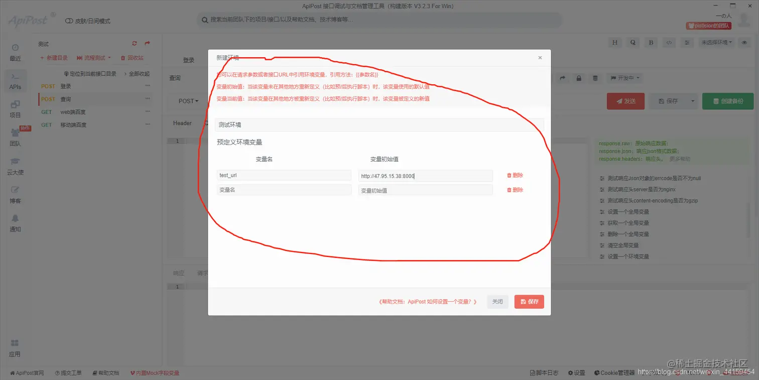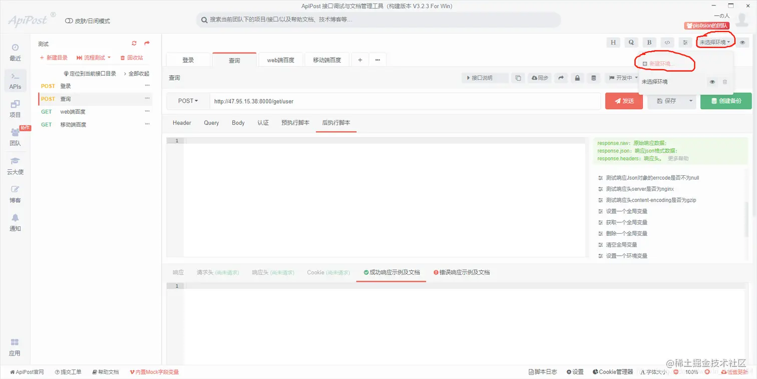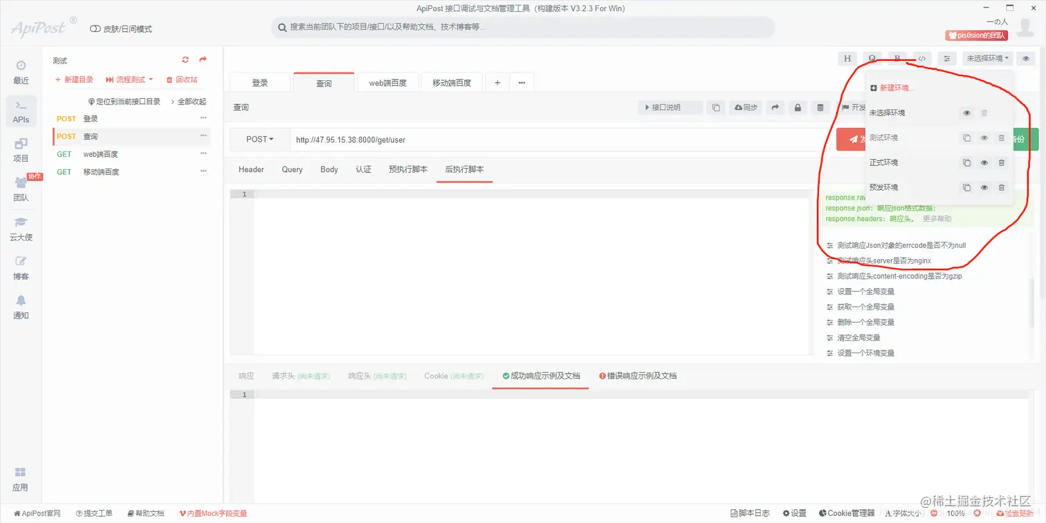 前言 随着web技术的发展,特别是前后端分离的架构主键成为主流,我们后端程序员调试的时候不再依赖页面去操作,而是直接调试接口。对于没有权限控制的GET接口而言,这是一个非常轻松的工作,但是对于有权限的或者使用了其他方法(POST,PUT,DELETE等)的Rest接口,事情就不那么美好了,还好有apipost这个神器能够帮我们解决这些问题,基本的使用我就不讲了,这一块网上的教程很多。这里主要提一些相对来说比较高级的用法。