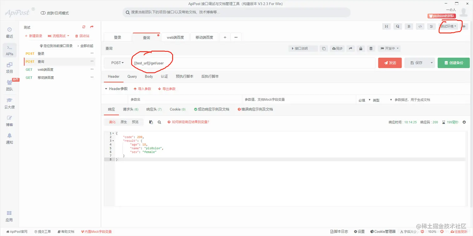选择环境,这里是测试环境,然后我们调用设置的环境变量,如图: