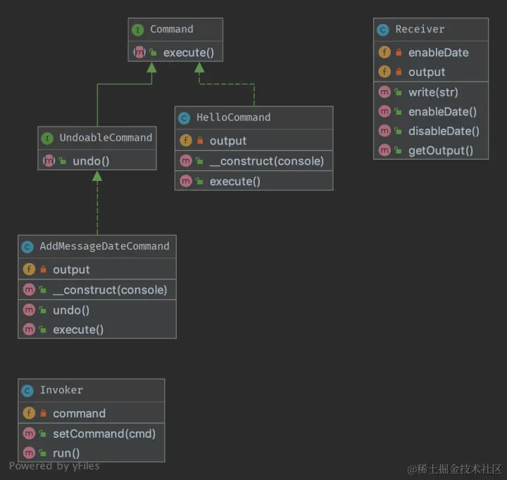 我们有一个调用程序和一个接收器。 这种模式使用「命令行」将方法调用委托给接收器并且呈现相同的「执行」方法。 因此,调用程序只知道调用「执行」去处理客户端的命令。接收器会从调用程序中分离出来。