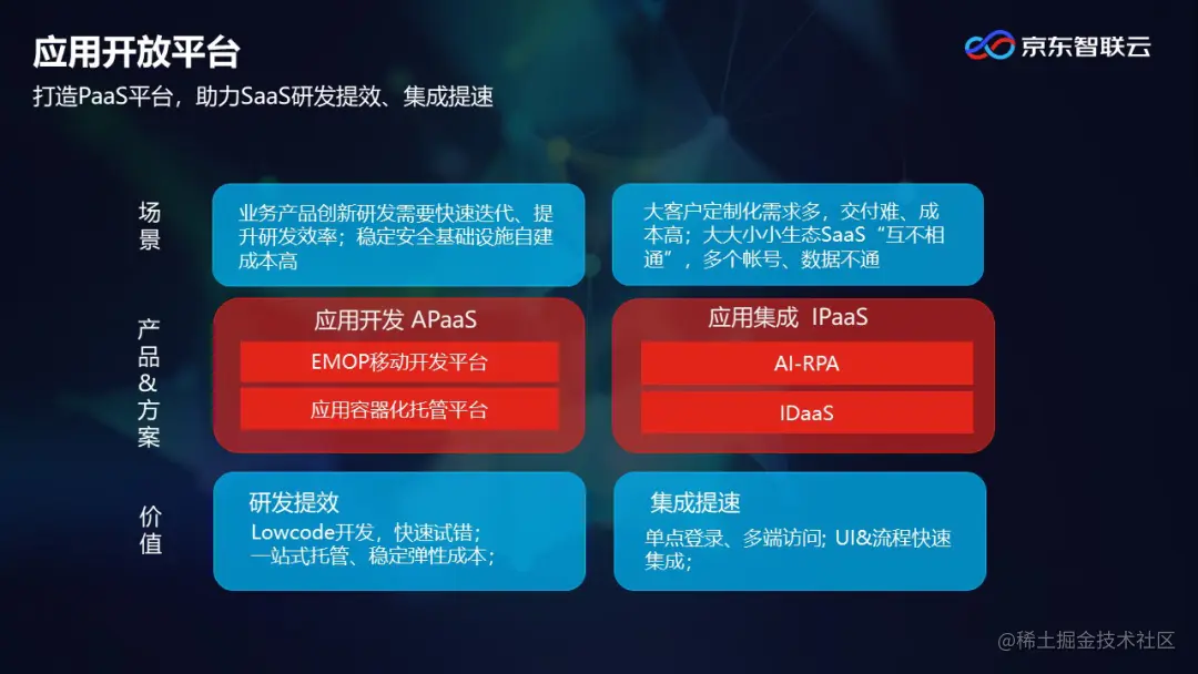 应用容器托管平台,提供从资源采购到应用部署、运维的“多租、一站式、稳定”弹性应用托管平台。EMOP 移动开发平台可助力企业研发提效;IDaaS 统一身份认证平台,可面向企业提供专业的统一身份管理和访问控制的解决方案;RPA 企业级流程自动化,帮助京东物流及餐饮业等,打破信息孤岛,实现了降本增效跟自动化。