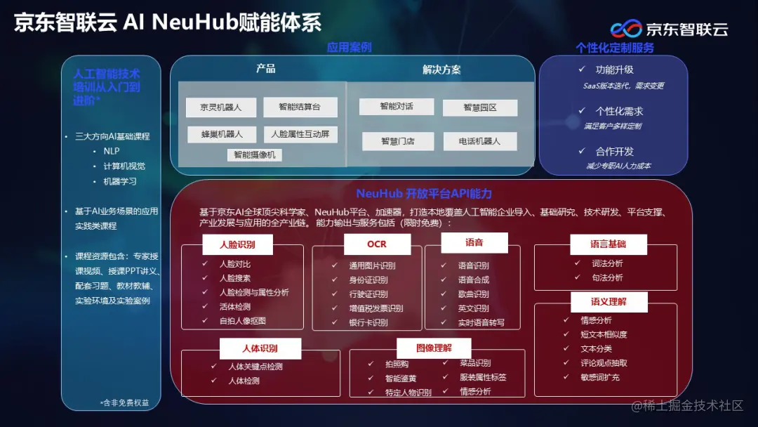 是对京东技术能力的整合输出平台。它既包含了新一代人工智能开放创新平台“国家队”的核心——NeuHub 京东人工智能开放平台,既在为企业提供全面的 AI 能力的同时,又并基于京东的 AI 业务场景提供了系列的应用实践类课程,全面赋能合作伙伴的产品智能化。下图是京东智联云 AI NeuHub 赋能体系: